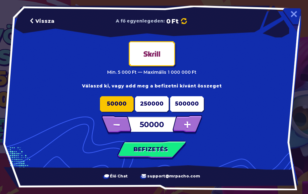 | Skrill | 5.000 Ft – 1.000.000 Ft | Azonnali | 5.000 Ft – 1.000.000 Ft | Azonnali | 0% |