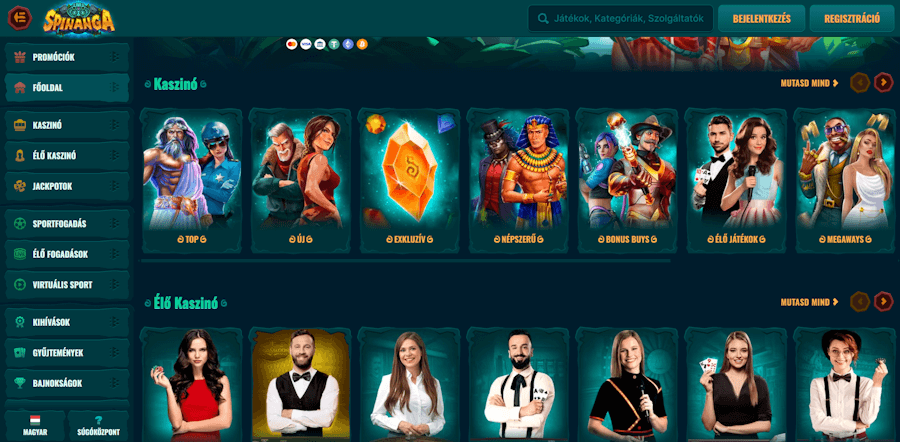 A Spinange kaszinó oldalára érkezve egyből feltűnhet, hogy a Spinanga teljesen magyarosított és lokalizált weboldallal rendelkezik, így a magyar játékosoknak sem kell fordítással törődniük. A Spinanga oldalán egyből két leginkább inkákra hajazó teremtmény fogad minket, hiszen az egész oldal egy dzsungeles témával van ellátva. A kaszinó témája tehát mindenképpen egyedi, így a kaszinóban található szövegek színvilága is ehhez a színkombinációhoz igazodik. Az oldal tetején találhatjuk a sárga “regisztráció” gombot, majd az elérhető játékokat kategóriákra bontva. Alább pedig egy rövid leírást találhatunk a Spinanga kaszinóról.